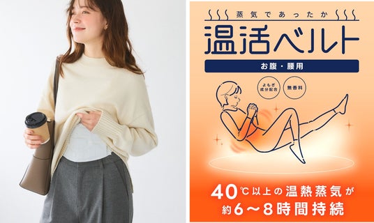 「温活ベルト」は、よもぎ成分配合の温熱シート付きベルトでお腹を温め、冷え性の方だけでなく、カイロによる火傷などのお困りを解消するアイテムです。