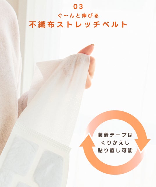 伸縮性に優れたストレッチベルトを採用しており、身体にぴったりとフィット。運動時にもズレにくく、快適な温めを提供します。また、何度でも貼り直しが可能なので、いつどんなときでも最適な位置に調整できます。