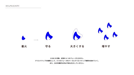 今回のリブランディングに伴い、ビジュアルコンセプトもアップデートいたしました。「CORE」の語源であるラテン語の「cor(心)」と「熱中する」というキーワードから、“炎”と“着火”を重要なコンセプトとしています。