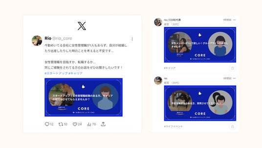 そんな背景から、COREではサービスの全面リニューアルを実施しました。リブランディングでは、女性同士がより気軽に繋がり、互いの悩みや経験を共有できるコミュニティSNSへと進化。フラットな関係性の中で共感できる仲間を見つけ、女性の不安や悩みを解消し、キャリアに関する行動に繋がる場を提供します。
