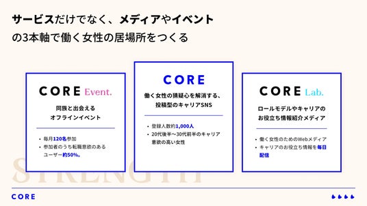 「リーダーシップのあり方を変える」をミッションに、女性のキャリアをサポートする企業です。働く女性のためのコミュニティSNS『CORE』、女性活躍推進に向けて企業を支援する、伴走型人事代行サービス『CORE Work』、働く女性の選択を応援するオウンドメディア『CORE Lab.』を展開中。