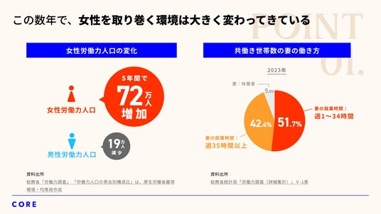 これまでCOREでは1on1のマッチングサービスを提供してきましたが、「登録後、相談に踏み出せない」「相談する・されるといった関係性が固定化されやすい」といった課題がありました。また、この数年で女性労働人口が増加し、女性を取り巻く環境が大きく変わってきています。
