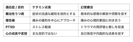 「治療法の違いがもたらす可能性:ケタミン点滴 vs 幻覚療法」