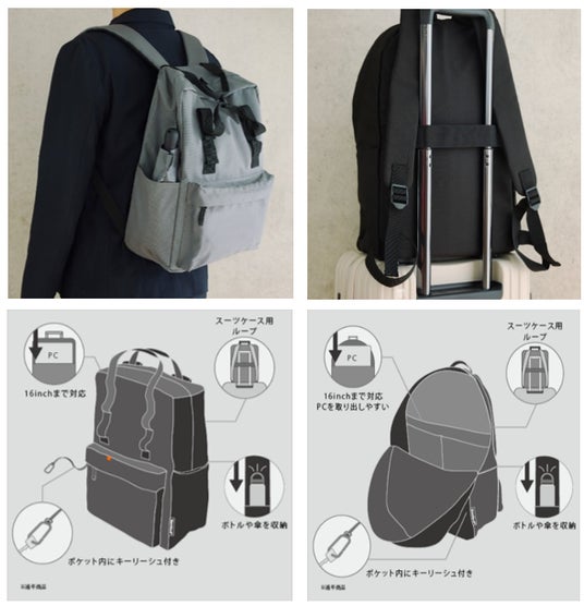 多機能リュックシリーズは、「カジュアルスクエアリュック」(2種、写真左)と「取り出しやすいリュック」(2種、写真中央)の全4種をご用意しています。荷物の取り出しやすさを考慮した設計で、16インチまでのパソコンが入れられるポケットや、スーツケース用のループ、鍵を探しやすいキーリーシュなど、多くの機能を取り入れた使い勝手のよいデザインに仕上げました。
