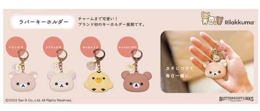『リラックマ』×『BUTTON&CUFFLINKS』のコラボアクセサリーでは初めてとなるチャームまで可愛いラバーキーホルダーは「リラックマ」「コリラックマ」「キイロイトリ」「チャイロイコグマ」の全4種類を展開。