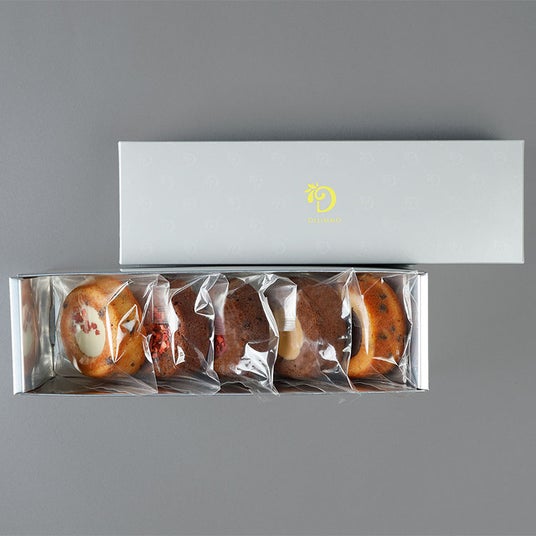 ティグレが5つ入ったアソートセット。口どけよく焼き上げるために金属製の型と熱風の出るオーブンで焼き上げます。表面は香ばしく中はしっとり焼き上げる事で、中に詰めるガナッシュやクリーム、ジュレのコントラストが特徴的な味わいを生みます。