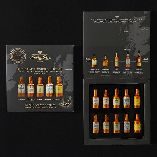 シングルトン、ダルウィニー、オーバン、タリスカー、ラガヴーリンの5種類の世界的に有名なシングルモルトスコッチウイスキーをダークチョコレートに閉じ込めました。ウイスキー好きな方へのギフトにおすすめの、10本入りのアソートボックスです。