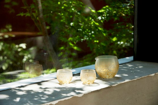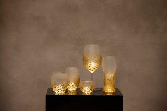 「Stardust Akari」は、本金沢箔がグラスの中で乱反射を起こし、まるでキャンドルが静かに灯っているような光を内包するシリーズです。金沢箔の種類は金箔とシャンパンゴールド金箔(※1)の2色のお色味を用意しました。金箔はあたたかみのある光を、シャンパンゴールド金箔は瑞々しい光をお楽しみいただけます。箔一の熟練職人により美しく均一な輝きを放つ箔を「ちらし」と呼ばれる伝統技法で、星空のようにグラスへ施しました。金沢箔の輝きが幻想的な瞬間を演出します。