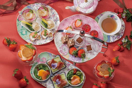 ティーセットに咲き乱れる花々が初春を感じさせるウェッジウッド「バタフライブルーム」シリーズで提供するAFTERNOON TEA with “SIROCCO”「ストロベリー&ショコラ」。セイボリーは、いちごを使った「ストロベリーとモッツァレラチーズのトスタ」や生ハムの塩味とサワークリームが絶妙なハーモニーのオープンサンドがおすすめです。スイーツのおすすめは、いちごに縁どられたカスタードプリンの下に隠された濃厚カスタードクリーム&パイ生地のサクサク食感が楽しい「ストロベリープリンアラモード パフェ」と、大人の味の「ショコラショートケーキ」。スイスの高級ティーブランドSIROCCO TEAは季節によって少しずつセレクションを変えて提供しています。