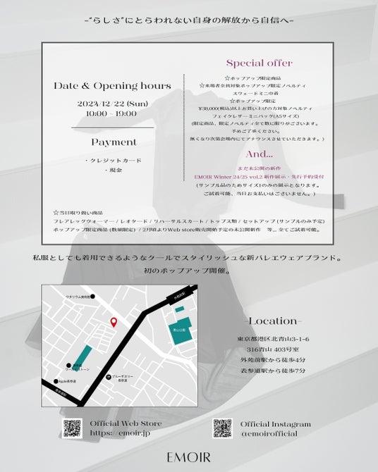 他のバレエウェアブランドにはあまりない、クールでスタイリッシュなデザインで商品展開をするEMOIR(エモア)がこの度ブランド初となるポップアップ開催が決定致しました。