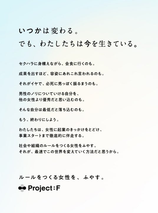 株式会社Sworkers(よみ:スワーカーズ、本社:東京都渋谷区、代表取締役社長:坡山 里帆、以下 Sworkers)は、女性起業家を増やし、社会のルールをつくる女性を増やすための一連の取り組みである「Project:F」(よみ:プロジェクトエフ)を立ち上げました。