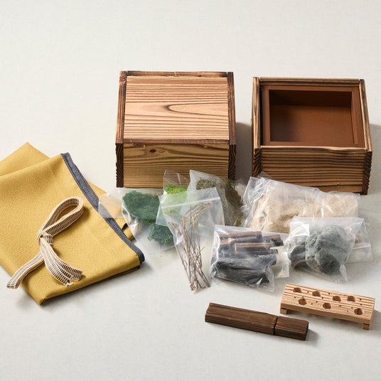 紀州景石と黒竹・穂先の入った焼杉板の箱に、プリザード加工を施したコケと紀州備長炭を盛り付け、幻想的な庭を表現した箱庭です。アレンジ例はございますが、お好きなパーツを配置して、思い描く箱庭を自由にデザインしていただけます。期間中は、ぜひ実際に箱庭を体験してつくる楽しさを味わていただければと思います。ご希望のお客様にはその場で商品をご購入していただけます。ホリデーシーズンの贈り物にもおすすめです。
