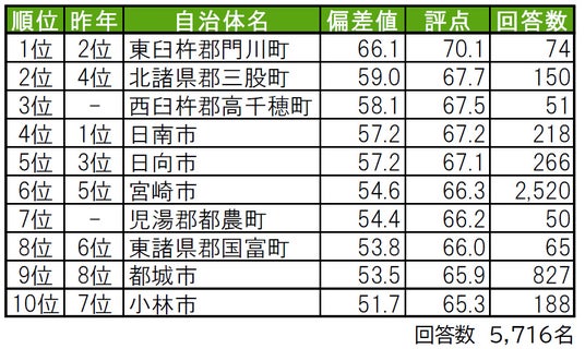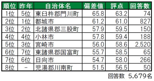 1位は東臼杵郡門川町で、昨年5位から順位を上げました。2位は都城市、3位は北諸県郡三股町です。その他、トップ8内で今回初登場の自治体は8位の児湯郡川南町(こゆぐん かわみなみちょう)で、昨年は累計回答数が50名未満でランキング集計対象外でした。