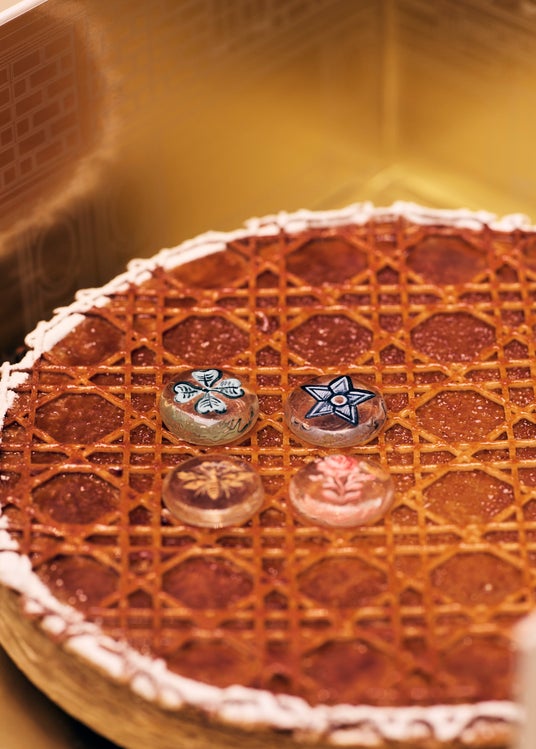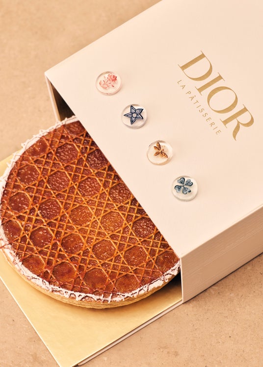 甘い喜びへのオマージュのように、ディオールはシェフのジャン・アンベールと彼のコラボレーター、ロミュアルド・ビザールによって考案された「ガレット デ ロワ」をお届けします。最上の瞬間を祝うための洗練されたスイーツはヘーゼルナッツとアーモンドのフランジパーヌ、そして軽いパイ生地で構成されており、魅惑的なひとときを約束します。ディオールの伝統を象徴するエレガントな「カナージュ」のラインがクリスピーな表面に描かれ、スター、四つ葉のクローバー、ミツバチ、薔薇といった創設者クリスチャン・ディオールの幸運のシンボルが交互にあしらわれたハンドペイントのガラスチャームが驚きを添えます。メゾンの歴史とムッシュ ディオールの「アール ドゥ ヴィーヴル(暮らしの芸術)」への情熱を讃えるこの甘美な作品は2025年1月3日から19日まで「30 モンテーニュ」の「ラ パティスリー ディオール」でご覧いただけます。