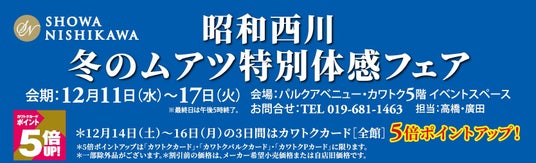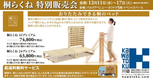 理想的な睡眠環境を提案する昭和西川株式会社(所在地:東京都中央区、代表:西川惠)は、パルクアベニュー・カワトク店5階イベントスペースにて12月11日(水)~17日(火)の期間中、「冬のムアツ特別体感フェア」「桐らくね特別販売会」開催いたします。