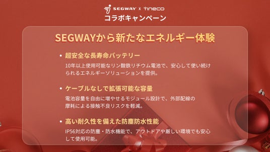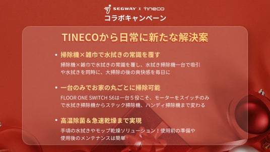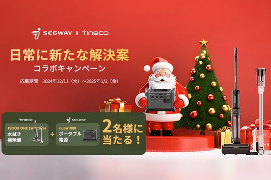 米国・欧州・日本においてAmazonでコードレス水拭き掃除機のベストセーラーNO.1(※)の販売実績を誇るティネコインテリジェント株式会社(日本支社:神奈川県横浜市、代表取締役:冷泠・レイリン、以下、Tineco)は、Ninebot inc.(Segway & Ninebot Group)が展開するポータブル電源Segwayと「日常な新たな解決案」のテーマとしてSNSコラボレーション企画を、2024年12月1日(水)~2025年1月3日(金)で実施いたします。