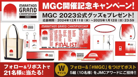 今回のキャンペーンでは、MGC(@mgc42195)Xアカウントをフォロー&該当投稿をリポストすることで『MGC2023限定公式グッズ』をプレゼントします!更に「ダブルチャンス」では、日本のマラソン界に期待すること、期待する選手や記録などを募集いたします。多くのマラソンファンの皆さまからのメッセージをお待ちしております!