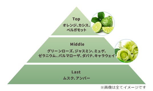 MIDDLE:グリーンローズ、ジャスミン、ミュゲ、ゼラニウム、パルマローザ、ダバナ、キャラウェイ