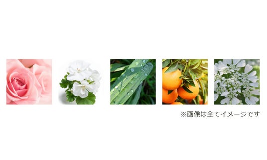 香料に「ローズオイル、ゼラニウムオイル、パルマローザオイル、オレンジオイル、キャラウェイオイル」をブレンドし、天然精油ならではの奥行きと深みを演出しています。