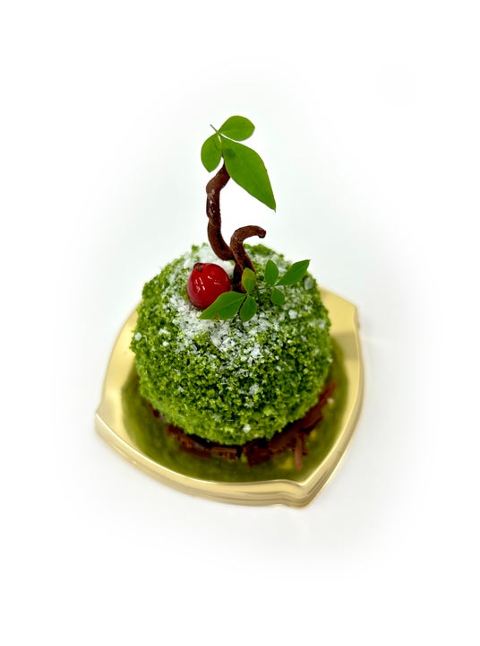 抹茶のスポンジで苔を表現し、削った氷餅(餅のフリーズドライ)で雪を表現したケーキです。中は、クリームチーズのムースにカシスクリームとオレンジジャムを合わせました。ローズマリーの香りを添えた、爽やかな風味に仕上げた苔玉です。