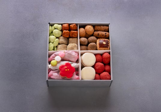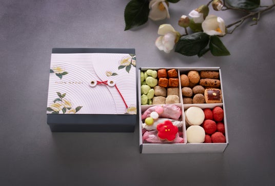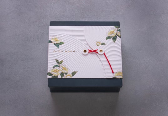 上段には糖質オフのクッキー缶「朔音-さくのね- 」から7種のクッキー(塩味:3種、甘味:4種)を詰め、下段には、新作のお菓子を詰め合わせた今だけの特別な仕様の詰め合わせです。新作のお菓子は、「山椒アーモンド」「柚子胡椒ピスタチオ」の2種のおつまみナッツに、「紅」と「白」を表現した紅白菓子「濃いちご」「柚子ホワイト」です。梅の花とお団子のアイシングクッキーで祇園らしさを添えました。京友禅の柄である椿をあしらった掛け帯を赤の留め紐で結び、めでたさを表現しています。