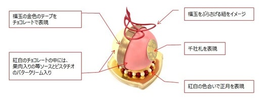 紅白のチョコレートで正月を演出し、中には、果肉入りの苺ソースとピスタチオのバタークリームを入れました。祇園の風物詩を表現した、華やかなスイーツです。