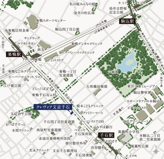 徒歩4分の都営三田線「千石」駅、徒歩7分のJR山手線 「巣鴨」駅の2駅2路線が利用可能。最寄り駅徒歩5分以内の駅近立地に加え、文京区内で山手線駅徒歩10分圏内という希少性の高いポジションです。