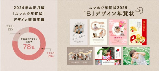 全体の78%※のご注文が干支入りデザインであるという実績から、「スマホで年賀状(TM)」はお客様のニーズにお応えするべく、2025年の干支である「巳(み)」にちなんだデザインを1,800点以上ご用意いたしました。