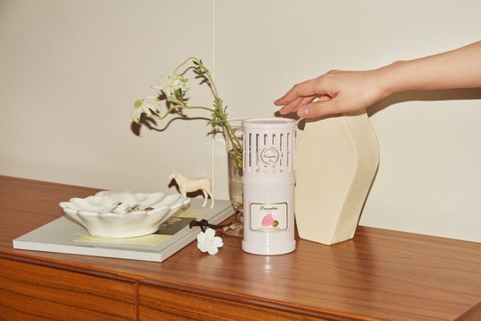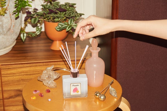香水瓶のようなデザインのボトル。倒れにくいガラス容器で、どんなお部屋もスタイリッシュに演出します。2025ver. ではスティックにピンクと紫色を採用し、柔らかく優しい印象を与えています。