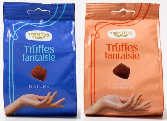 1948年創業のフランスのメーカー「ショクモド」から2商品を自社輸入しました。ギフトなどにもお使いいただける箱入りの「マテス ファンタジートリュフ」に対して、こちらはご自宅用により気軽にお楽しみいただけるスタンドタイプの袋のパッケージです。プレーンは濃厚でくちどけの良いトリュフ生地をほろ苦いココアパウダーでコーティングした大人な味わい。塩バタータフィーは滑らかなトリュフと細かく砕いたタフィーのカリっとした食感が特長的です。一粒当たりのサイズが小さく食べやすいミニトリュフです。
