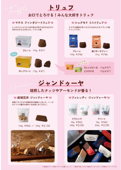 また、チョコレートの種類が多く商品を選べないという方や、何を購入すべきか迷ってしまうという方へのご提案として、「成城石井 チョコフェア 味バリエ図鑑」を作成いたします。フェア対象となる商品を、トリュフ、プラリーヌ、ジャンドゥーヤ、ドライフルーツ・ナッツ、板チョコ・タブレットチョコの、5つのカテゴリーに分類。パッケージだけでは伝わりづらいチョコレートなども、中身や断面図とともに掲載することで商品の分かりやすさと選びやすさをお客様にご提案いたします。店舗でリーフレットを配布するほか、当社ホームページや公式アプリにも掲出いたします。是非この機会に、お好みのチョコレートやデザートを探してみてはいかがでしょうか。