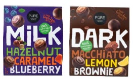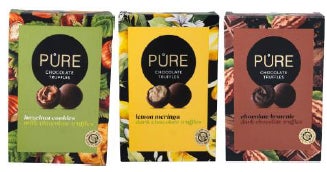 ピュア社は、トリュフを専門にしているラトビアのチョコレートメーカー。レモンメレンゲクリーム、ココアクリーム、ヘーゼルナッツクリームの3種類のフレーバーを自社輸入しました。ミルクとダーク、それぞれのチョコレートに包まれたクリームフィリングには細かいメレンゲ生地、ブラウニー生地が練りこまれており、なめらかな口どけの中にカリっとした食感がアクセントとなっています。