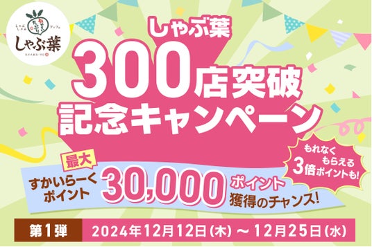 株式会社すかいらーくレストランツ(本社・東京都武蔵野市、代表取締役社長 中島 尚志)が運営する「しゃぶ葉」 では、2024年12月18日(水)にオープンする「港南台バーズ店」で300店を突破することを記念し、2024年12月12日(木)~12月25日(水)の期間中、「しゃぶ葉300店突破記念キャンペーン 第1弾」を開催いたします。