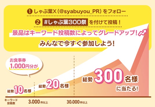 しゃぶ葉の公式X(@syabuyou_PR)をフォローし、キーワードの「#しゃぶ葉300祭」のハッシュタグを付けて、公式投稿を引用リポスト。「#しゃぶ葉300祭」の投稿数に応じて、賞品が当たる人数がアップグレードします。