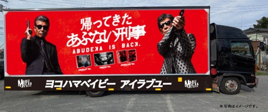 『帰ってきた あぶない刑事』のデザインにラッピングされたアドトラックが映画のロケ地を走行!