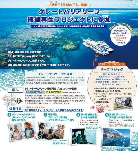 株式会社日本旅行(本社:東京都中央区、代表取締役社長:小谷野悦光)は、オーストラリア政府観光局・クイーンズランド州政府観光局・日本旅行業協会が共同で行う、グレートバリアリーフの珊瑚再生SDGsプログラムと連携した海外ツアー「オーストラリア 珊瑚の未来を紡ぐ旅ケアンズ6日」を発売します。