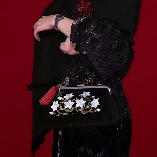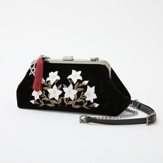 漆黒の生地に桔梗が花開く、ベルベットを使用したレトロな装いのがま口バッグ。