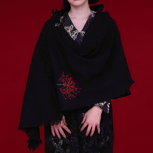 黒づくめの中禅寺の姿を模した様な佇まい。晴明桔梗をイメェジしたストールピンが付属します。ウールを用いた柔らかな肌触りで、端はフリンジのお仕立て。