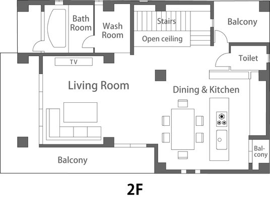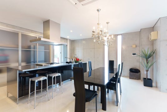 広々としたダイニングエリアと機能的なキッチンは、シンプルなデザインで統一されています。キッチンは広いカウンタートップと豊富な収納スペースで料理がしやすく、ダイニングは自然光がたっぷりと差し込み、リラックスした食事の時間を