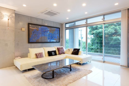 高い天井と大きな窓から自然光がたっぷりと差し込み、開放感あふれる広々とした空間です。モダンで落ち着いた色調の家具が、リラックスできる温かみのある環境を作り出し、洗練されたデザインが贅沢なひとときを演出します。