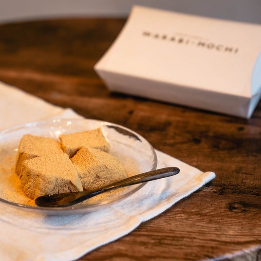 爪楊枝が刺さらない程の柔らかさで、お箸で食べていただく「生わらびもち 和三盆きな粉」(小箱650円、大箱1,200円)。