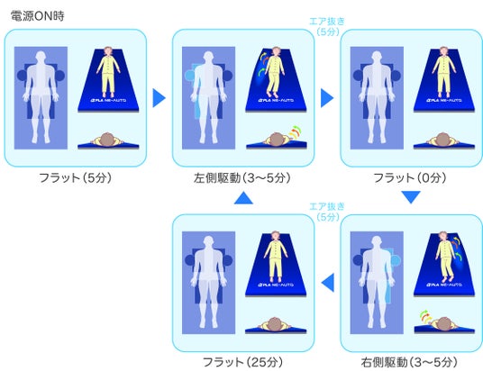 1.自動体位変換機能ウレタンフォーム下に配置した6つのエアセルが、穏やかに肩、胸、腰の順に駆動し、人の自然な寝返りを再現します。