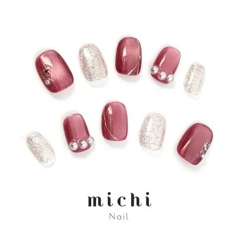 上品で深みのあるルージュカラーに、きらめくラメとパールがアクセントとして添えられたデザイン。指先に華やかさとエレガントな輝きをもたらし、特別なシーンにも映える仕上がりです。