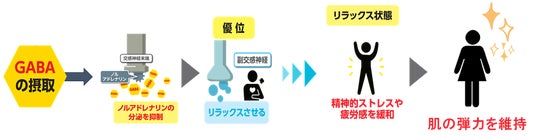 GABAが交感神経末端において、ノルアドレナリンの分泌を抑制することによって副交感神経を優位にし、ストレス緩和することで肌の健康に繋がります。