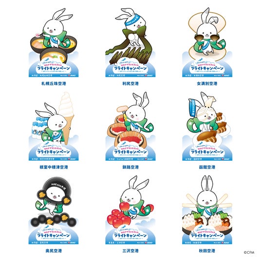 HAC就航地の全9空港に、各地の特産品をモチーフに新規制作された『ラビット・ユキネ』のフォトパネルが登場します。ラビット・ユキネが各就航地を満喫する姿を写真に撮って、ぜひハッシュタグ「#HAC冬のフライトキャンペーン」を付けてSNSでもシェアしてください。
