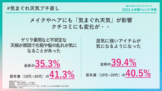 実際@cosmeが2024年11月に実施した「化粧品に関するアンケート」(以下、ユーザーアンケート)において、「メイクや髪のお直しについて、以下の中であなたの考えやお気持ちに当てはまるもの」を聴取したところ全体の35.3%が「ゲリラ豪雨など不安定な天候が原因で化粧や髪の乱れが気になることがあった」と回答。また、同じく全体の39.4%が「湿気に強いアイテムが気になるようになった」と回答しています。