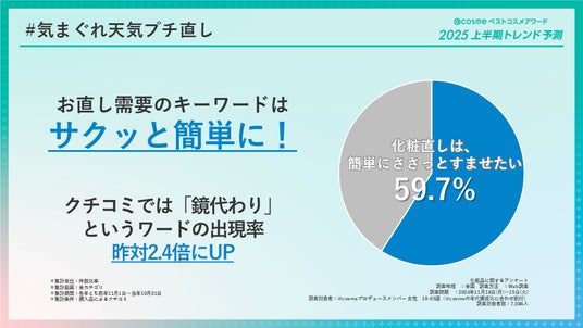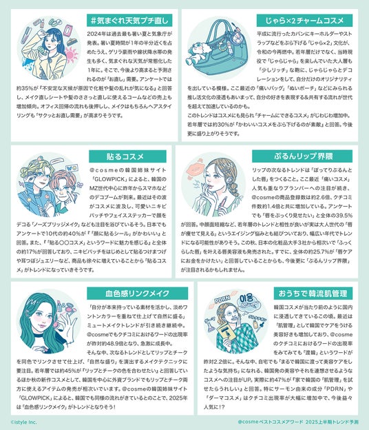 「@cosmeベストコスメアワード2025上半期トレンド予測」は@cosmeベストコスメアワードの関連企画であり、@cosmeに投稿されたクチコミや@cosme STORE/@cosme TOKYO、@cosme OSAKAでの売り上げ等の分析、その他ユーザーアンケートなど関連情報からみえる生活者の意識変化と美容プラットフォーマーとしての知見から、今後の生活者インサイトや美容トレンドを予測するべく発足された「@cosmeトレンド予測部」が、2025年の上半期のトレンドをキーワード化したものです。