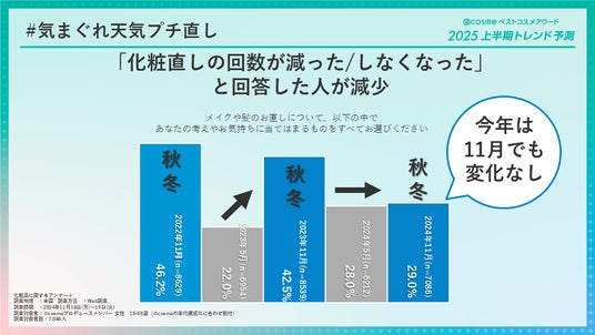 また、例年であれば冬時期の11月に聴取するユーザーアンケートでは「化粧直しが減った/しなくなった」と回答する人の割合が増加しますが、今年の同質問の聴取においては、5月のアンケートと同程度の回答率となり、季節による回答率の増減が見られず、気候の変化によってお直し需要が通年化していく可能性が垣間見える結果となりました。