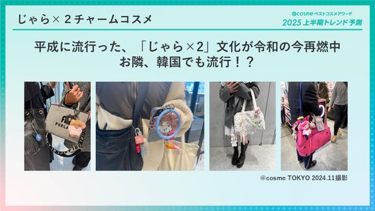 最近、携帯や鞄にじゃらじゃらとお気にいりのキャラクターなどのチャームをつける平成のトレンドが復活しています。2024年11月に@cosme TOKYOで行ったユーザー調査でも幅広い年齢の方が鞄にチャームをつけている姿が見られました。