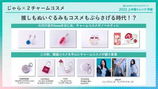 更に、そういったニーズを受けて、この秋、EITHER&「Pebble Blur Cushion」、coralhaze「コーラルヘイズ グロウロックゼリーティント」、BRAYE「リップスリーク / リップアンドチーク」など、チャームにできるコスメが定番商品としても登場してきています。